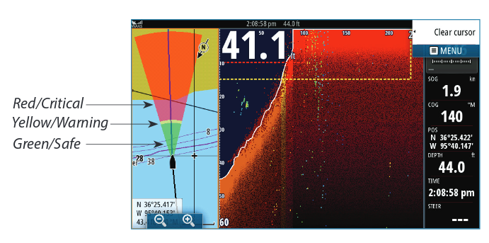 ForwardScan näyttää karttapohjan suuntavektorilla veden syvyyden.